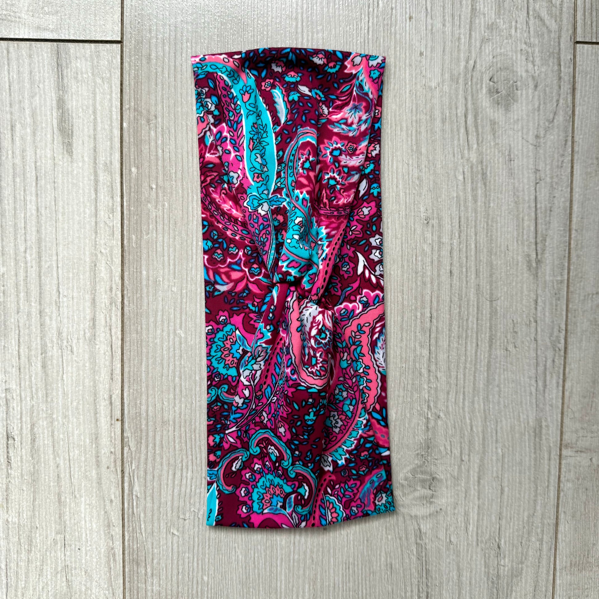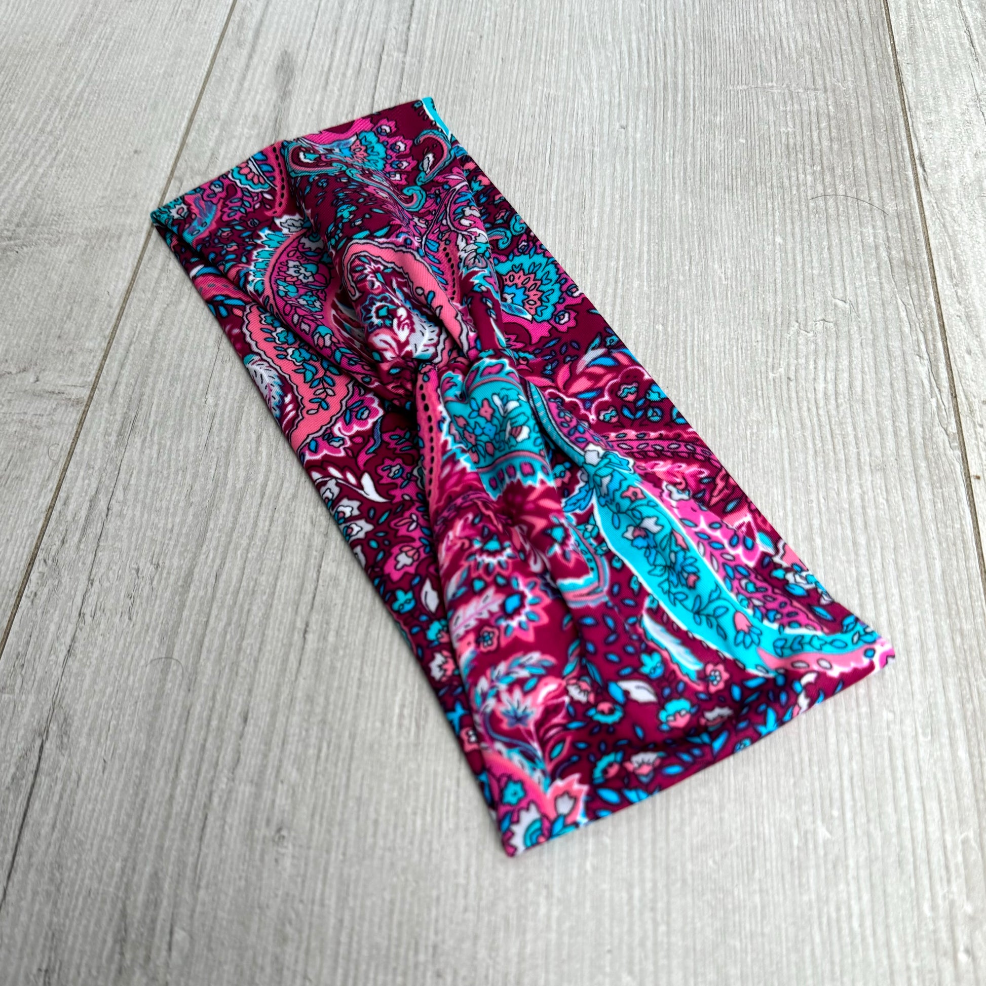 Cintillo burdeo estampado hecho cuidadosamente a mano con tela suave y elasticada. Úsalo hacia adelante o hacia atrás, útil para el trabajo, ejercicio, rutina de skincare, etc. Combínalo con tus outfits del día o con tus uniformes✨