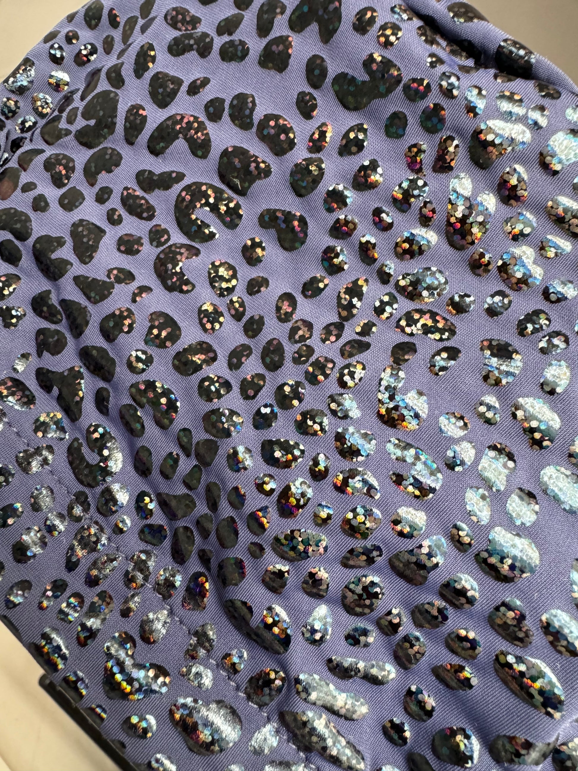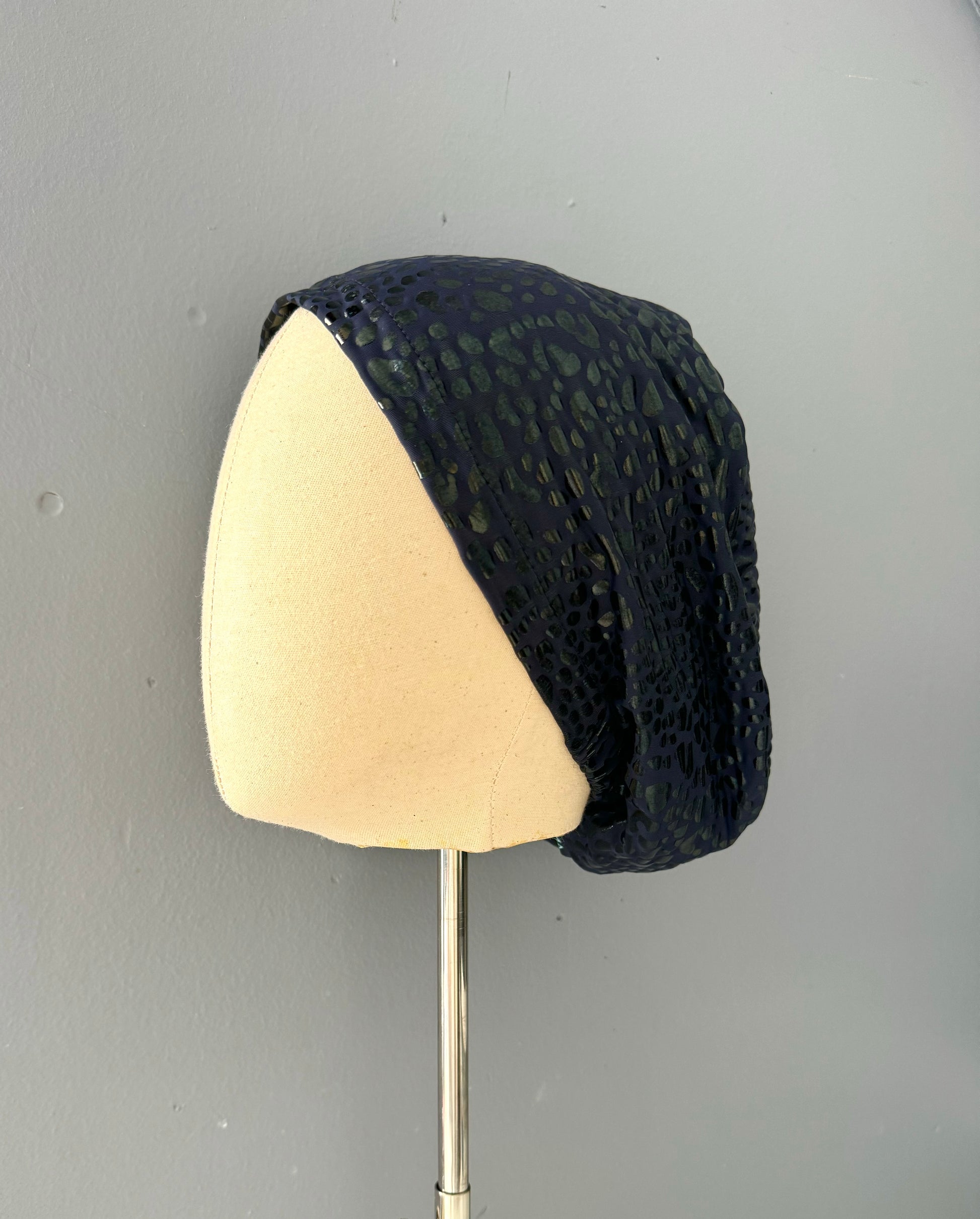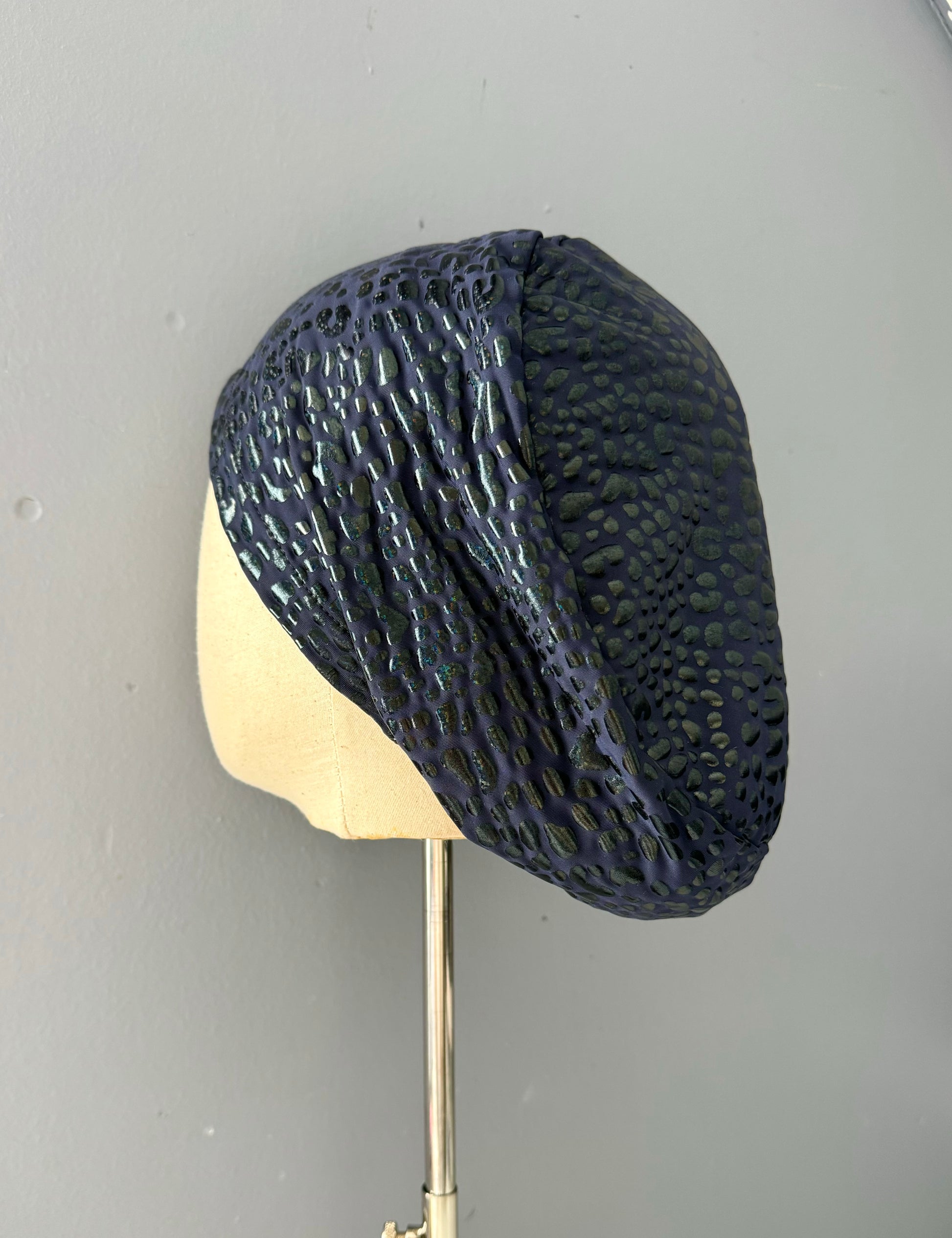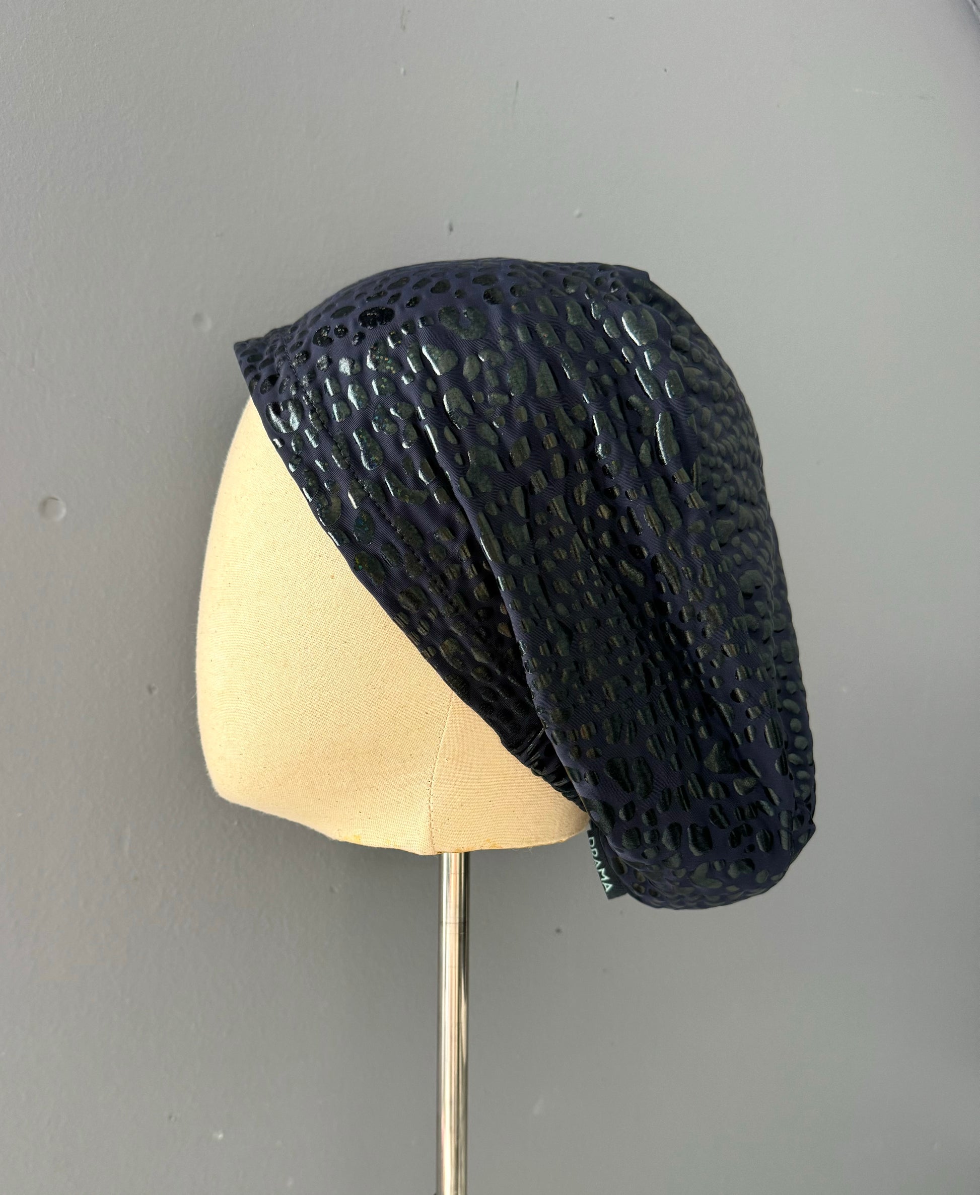 Cofia elasticada color azul marino con detalles holográficos brillantes. Tela de lycra de secado rápido y que no requiere planchado. Ideal para cabellos largos o cortos.