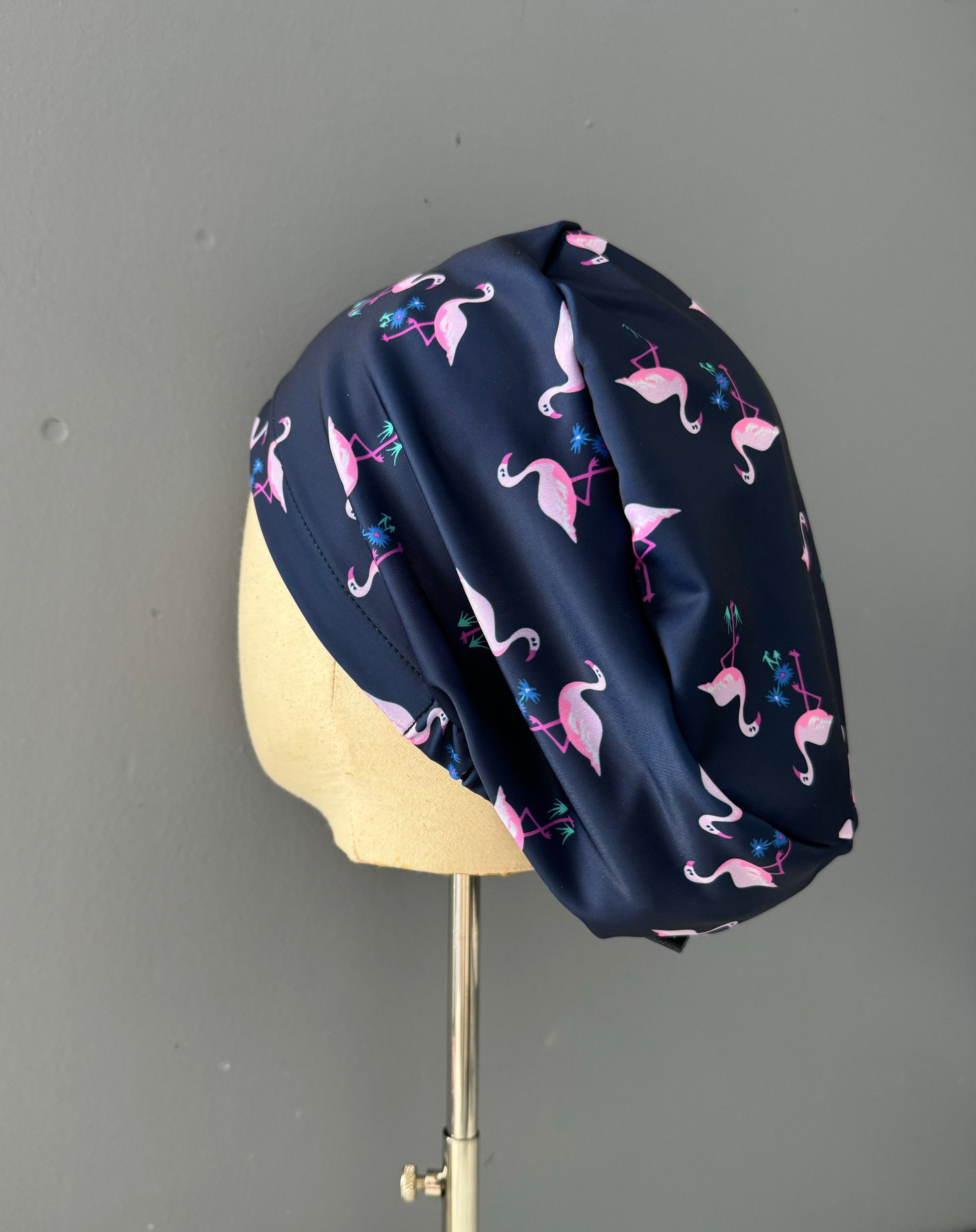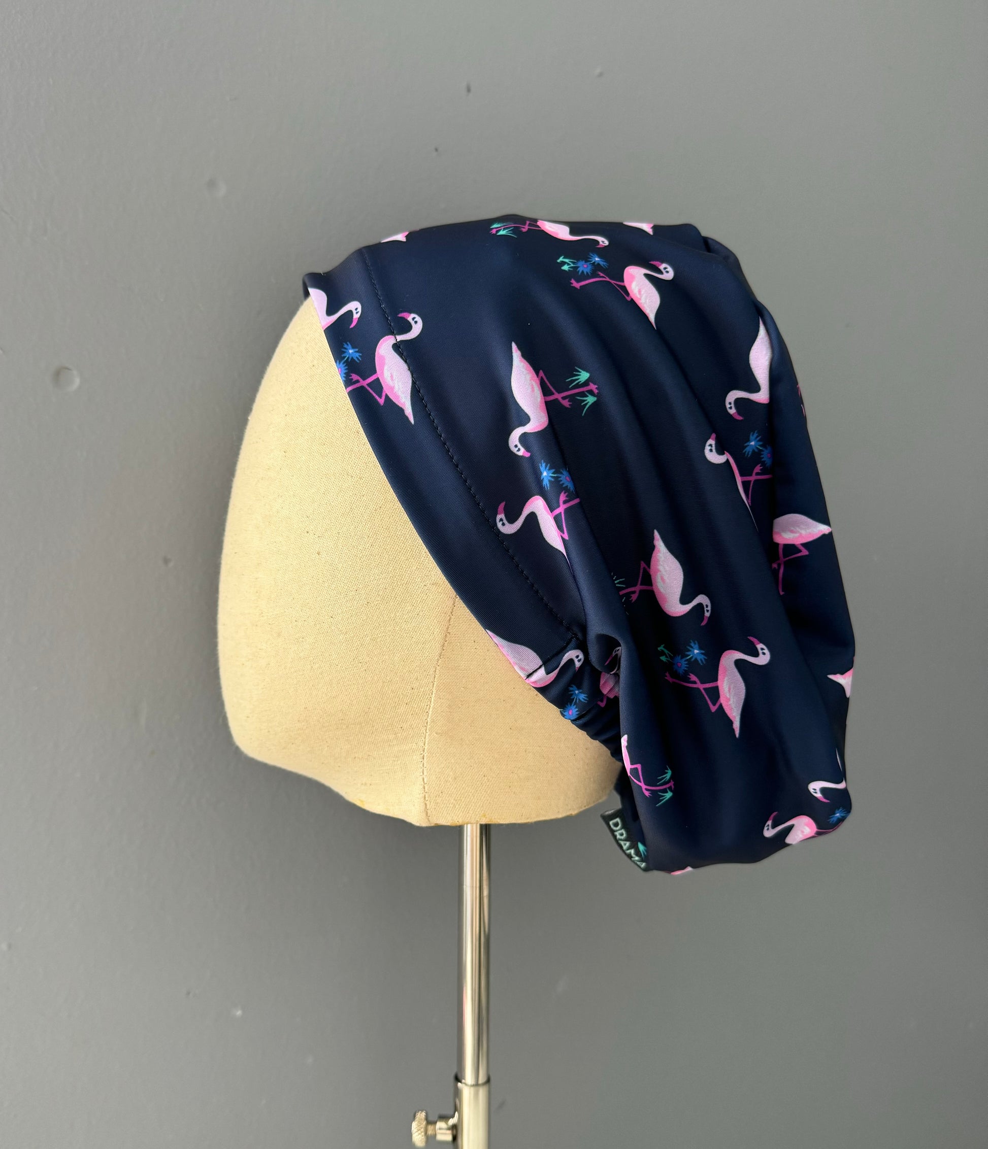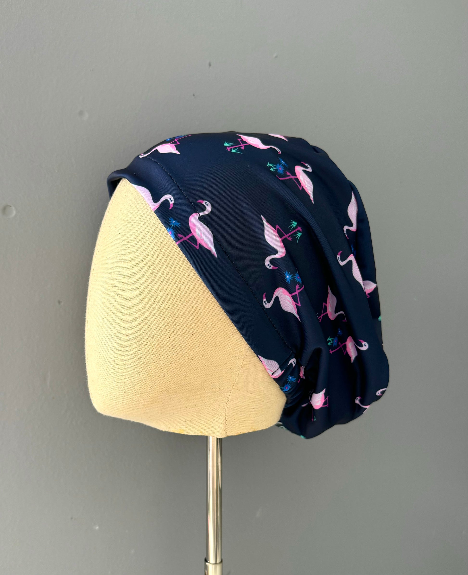 Cofia elasticada color azul marino con flamencos. Tela de lycra de secado rápido y que no requiere planchado. Ideal para cabellos largos o cortos.