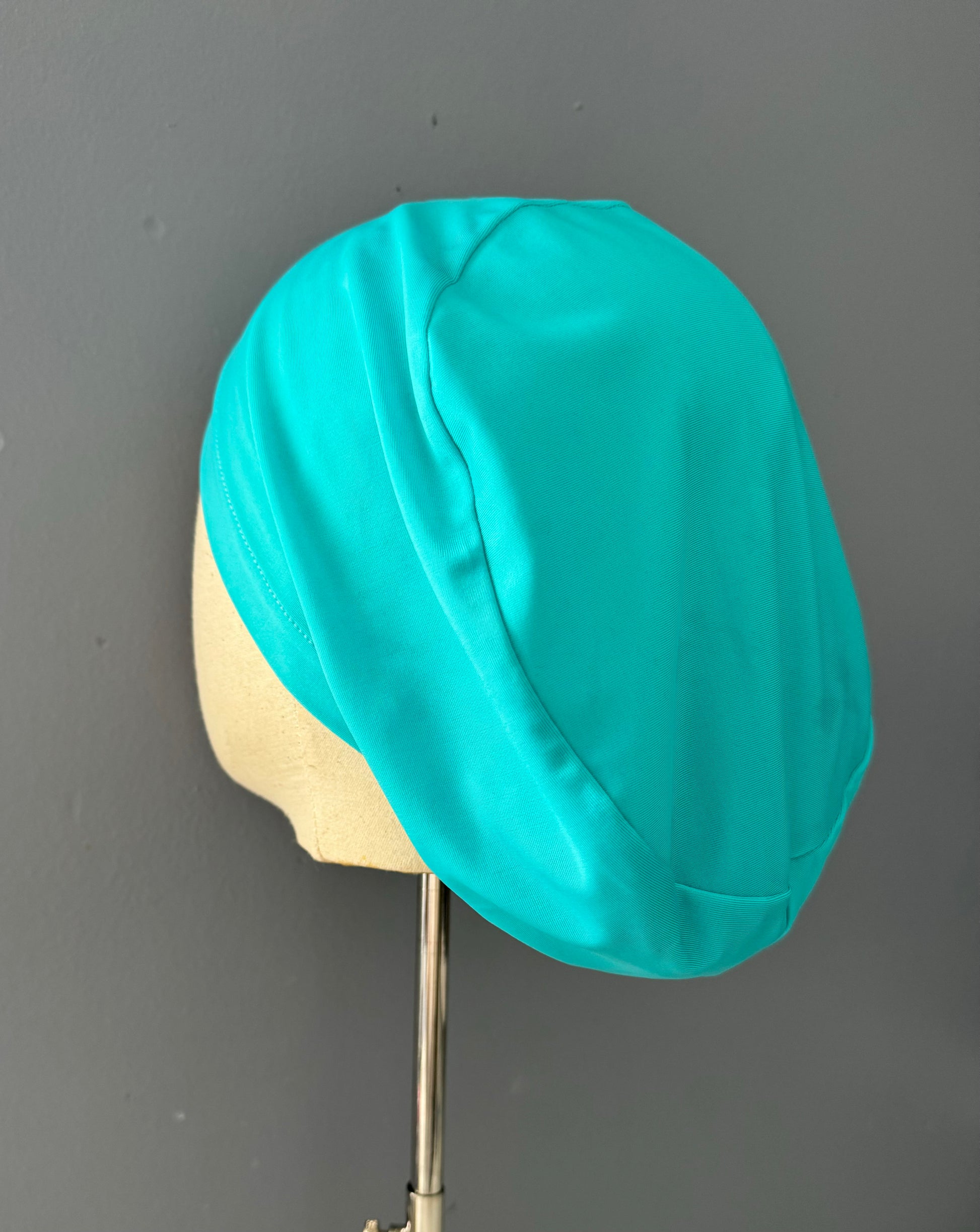 Cofia elasticada color turquesa. Tela de lycra de secado rápido y que no requiere planchado. Ideal para cabellos largos o cortos.