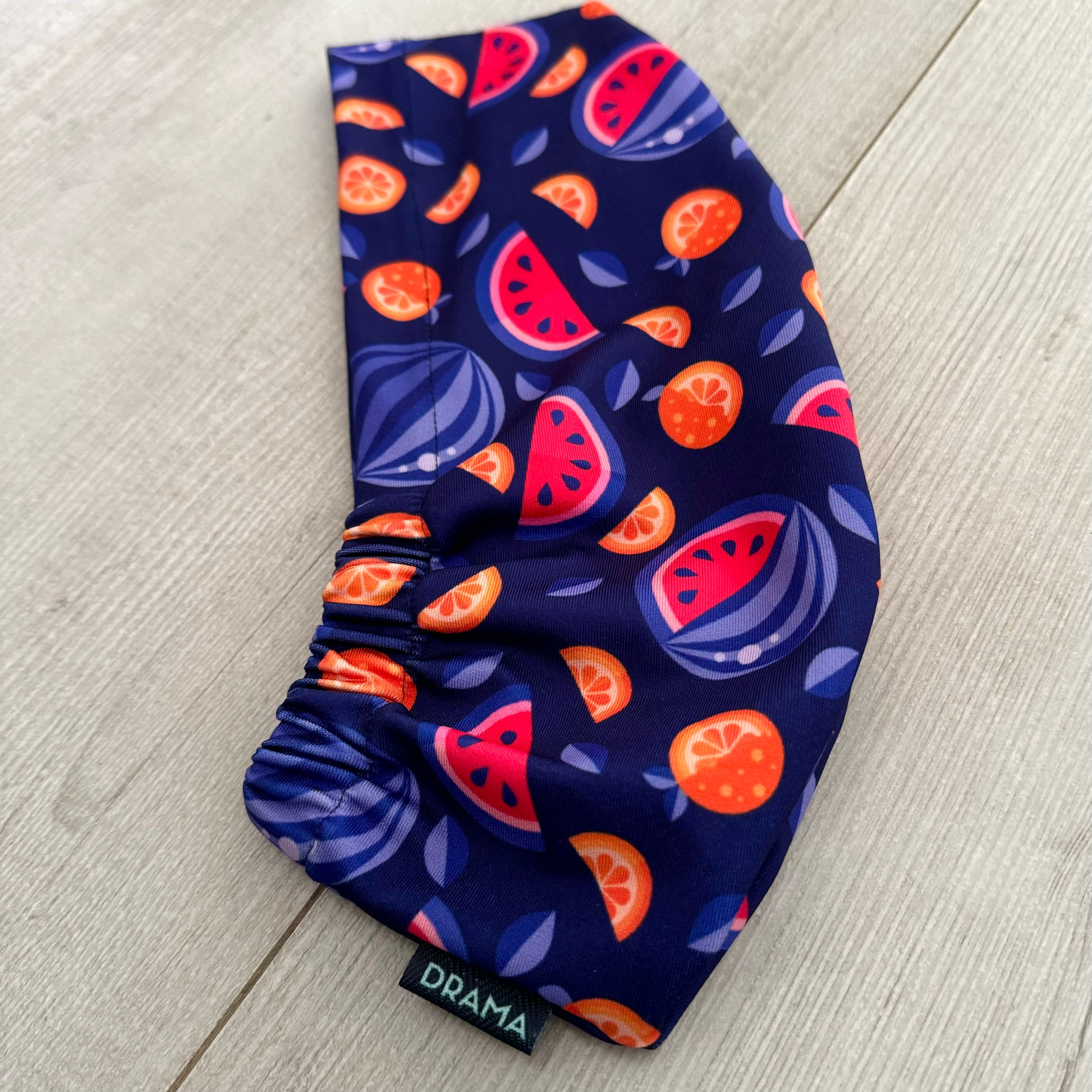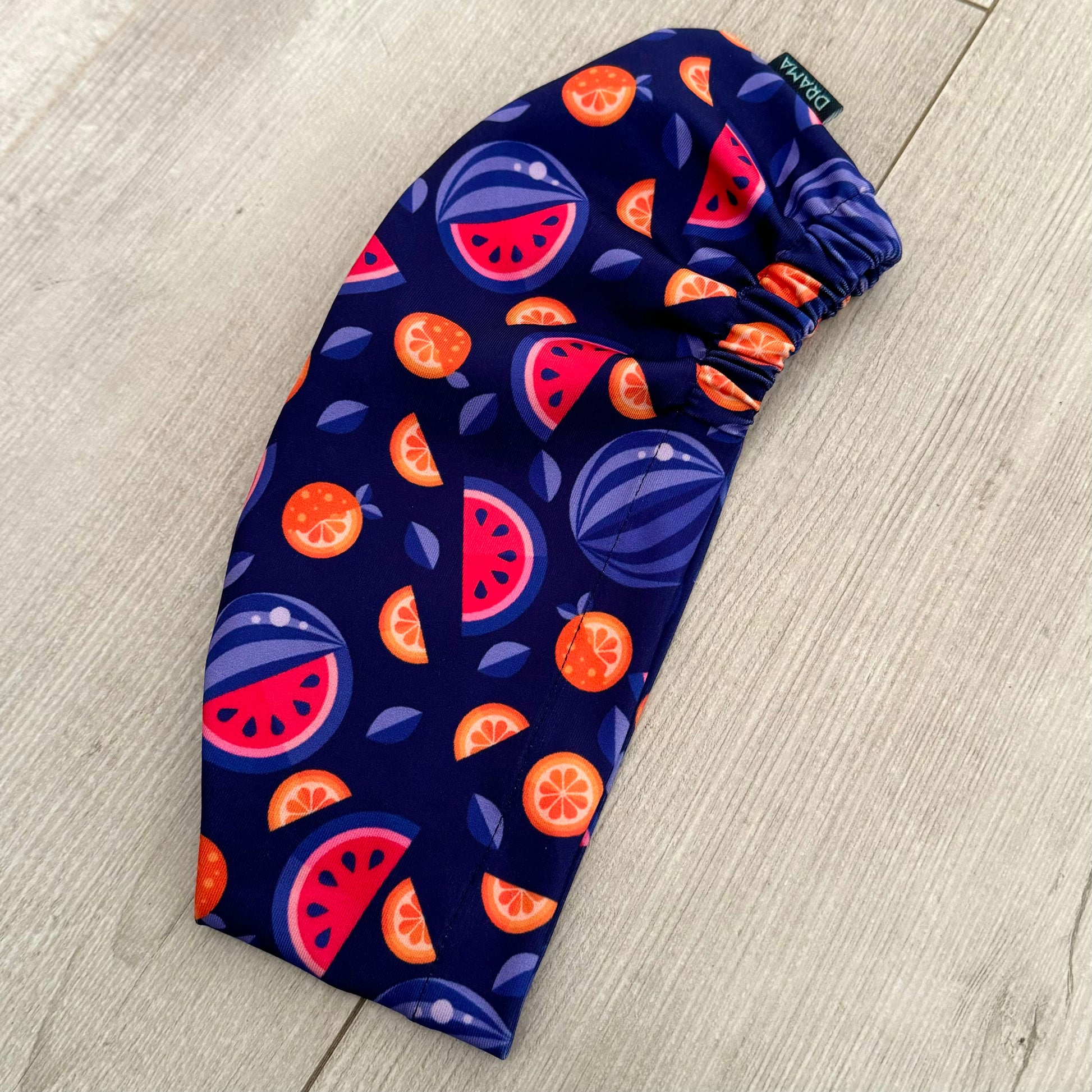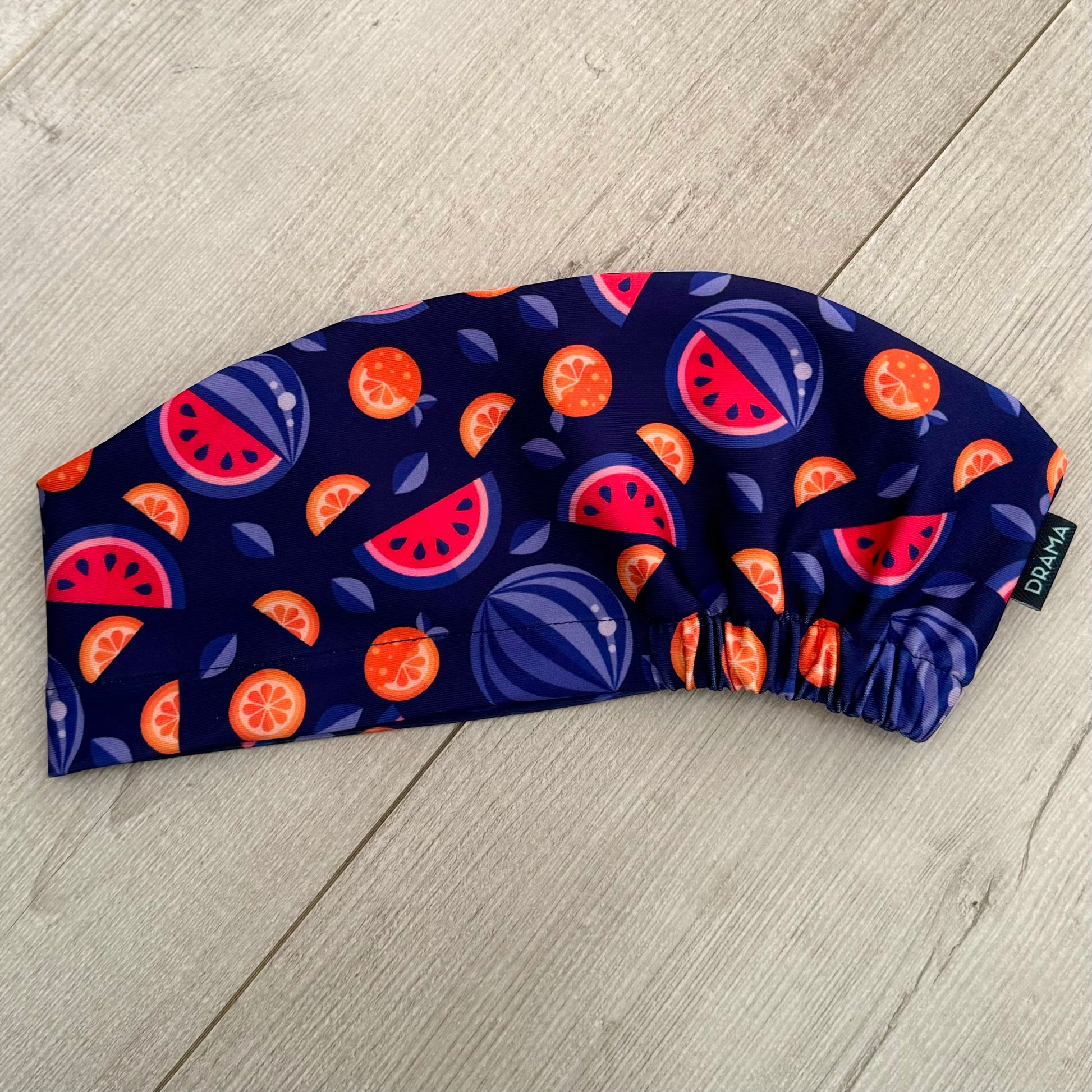 Cofia frutal fondo morado. Hecha cuidadosamente a mano con tela elasticada y de secado rápido que no requiere planchado. Excelente calce y amigable con el cabello.✨