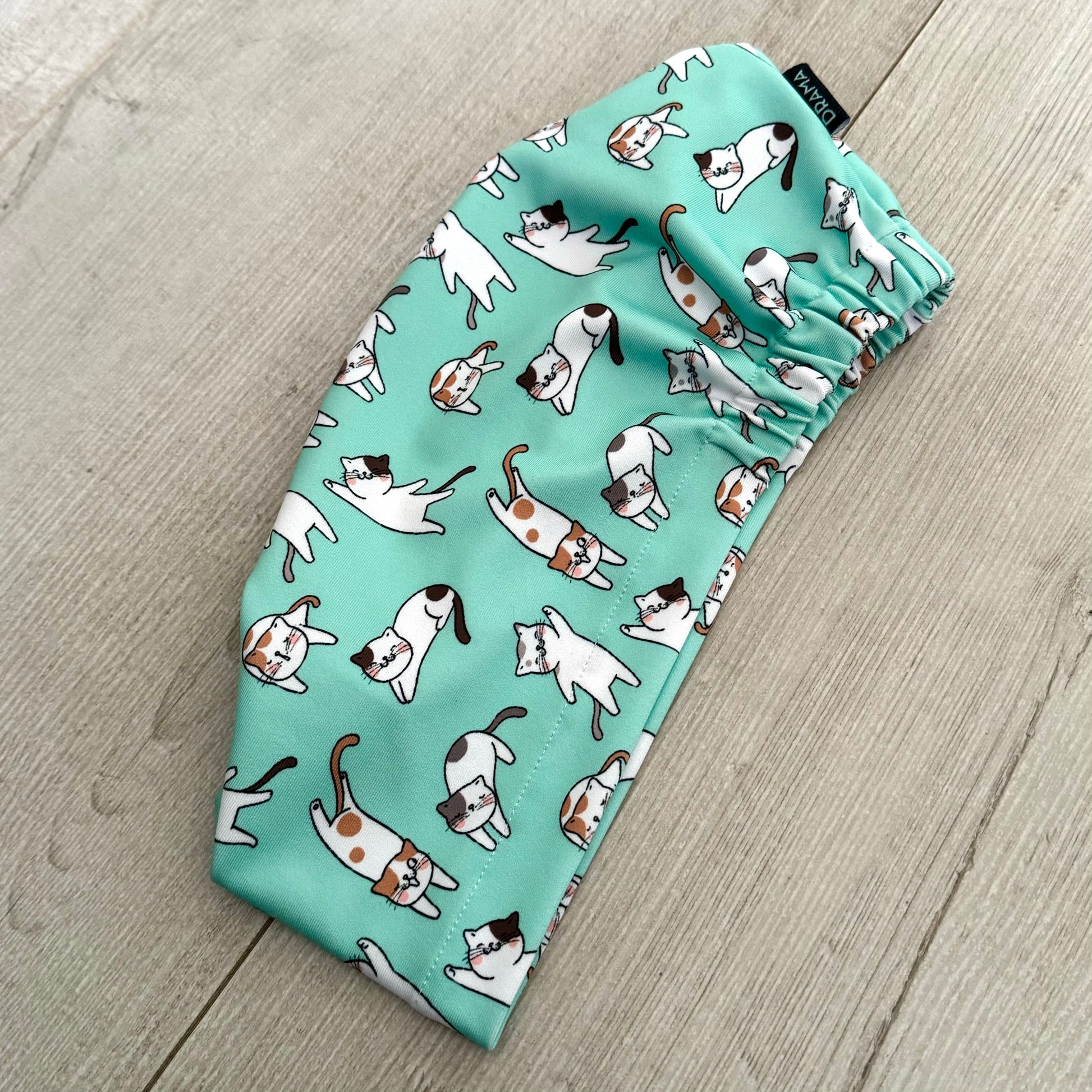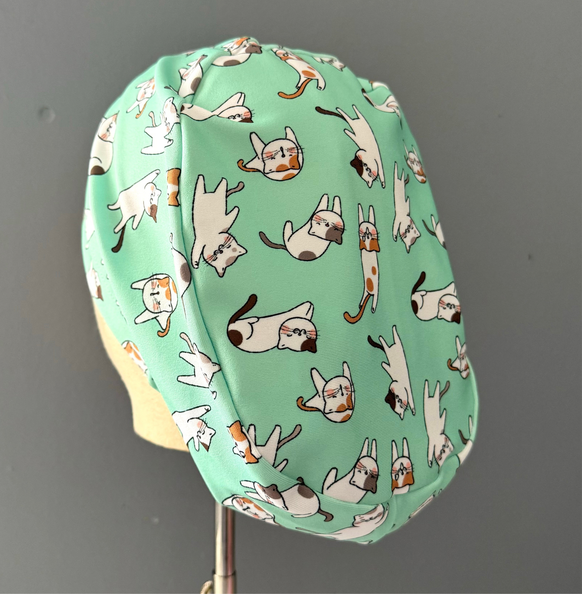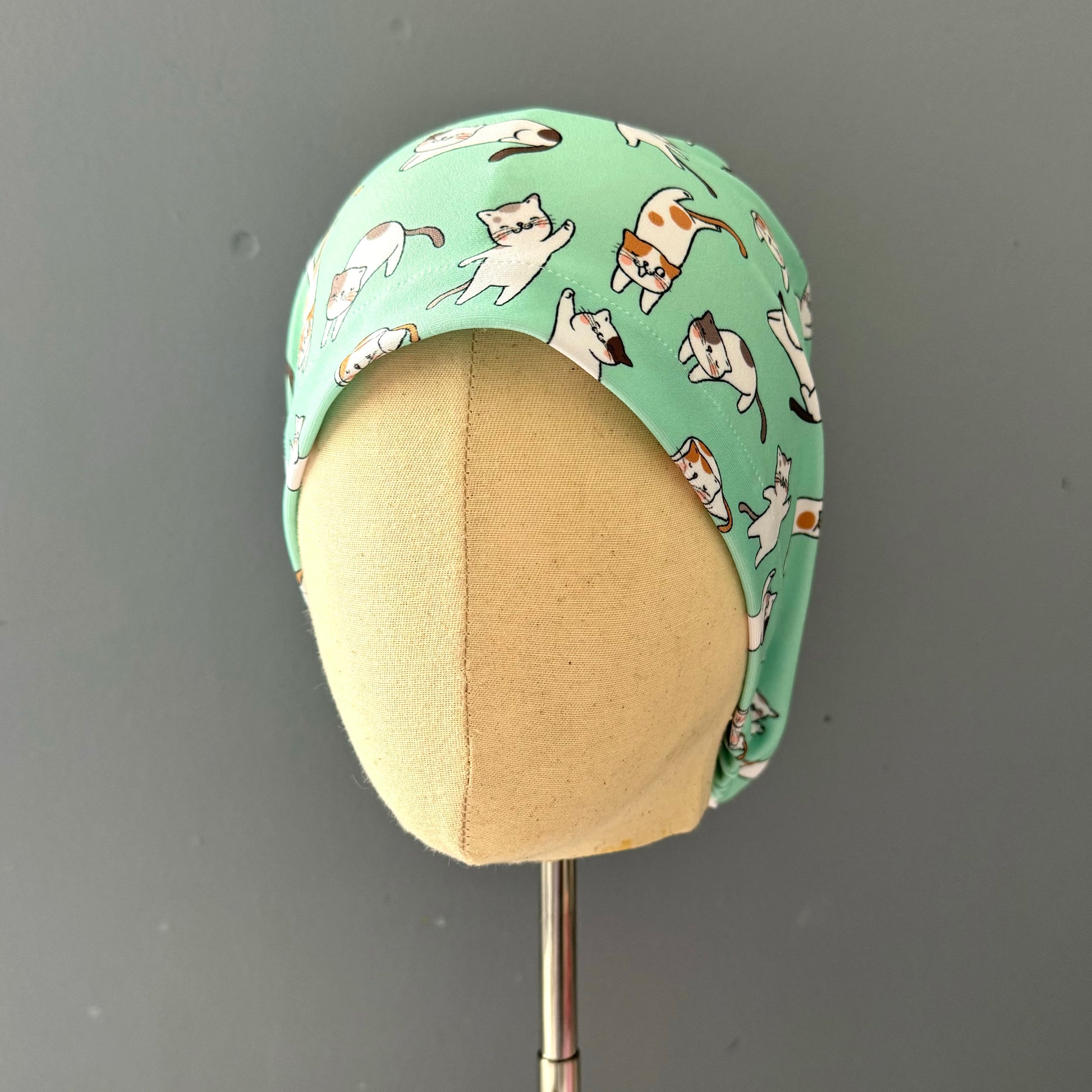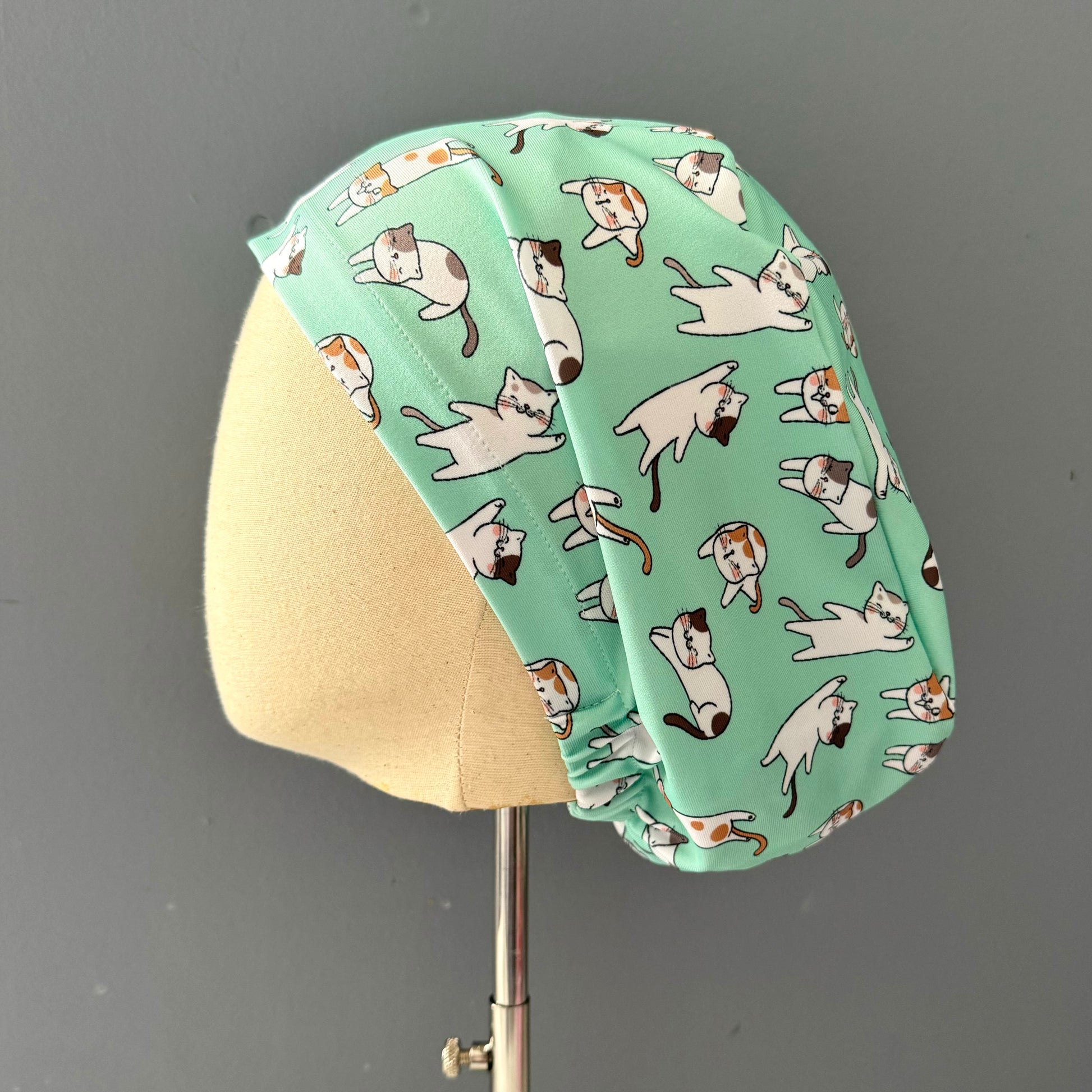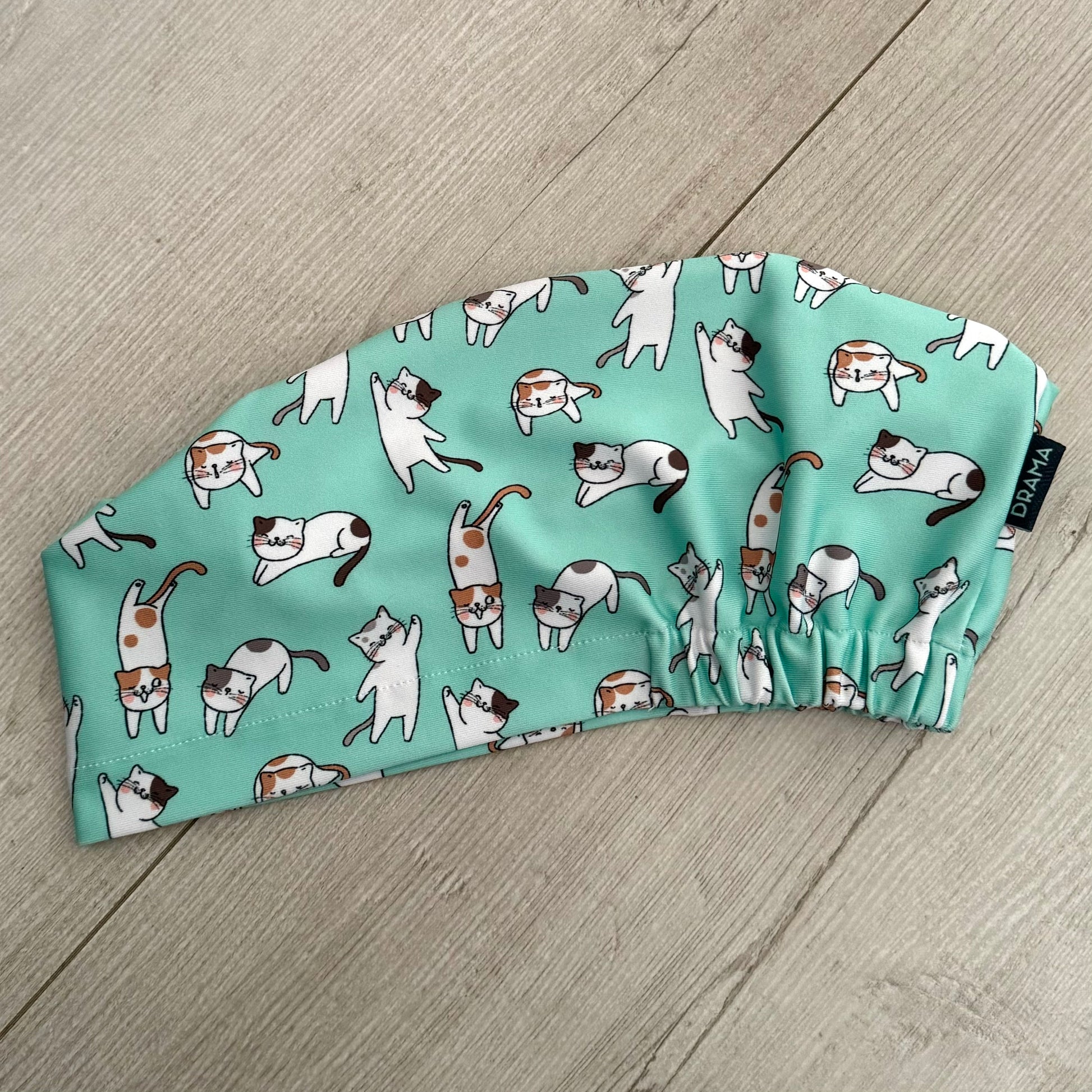 Cofia turquesa y gatitos. Hecha cuidadosamente a mano con tela elasticada y de secado rápido que no requiere planchado. Excelente calce y amigable con el cabello.✨