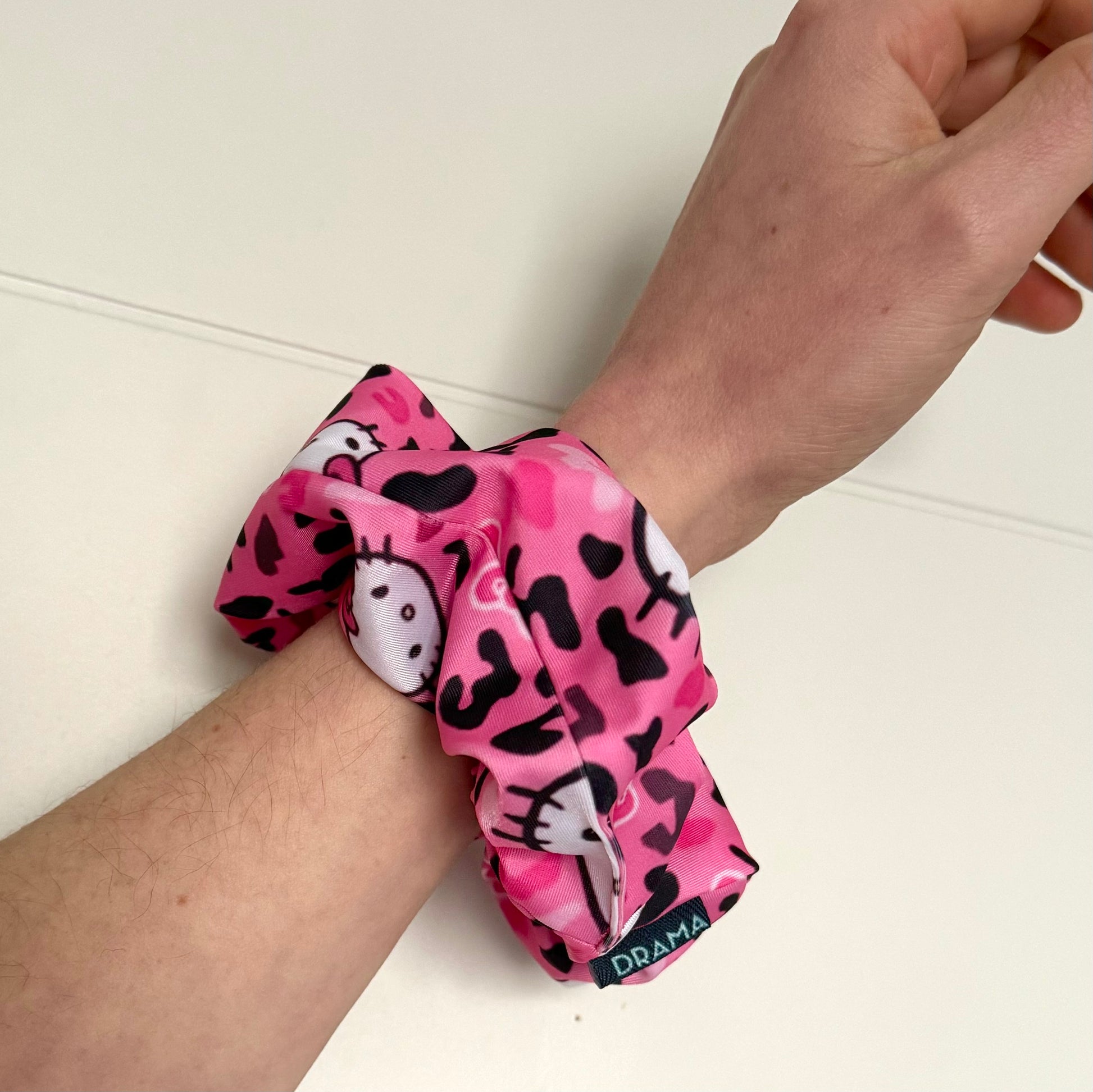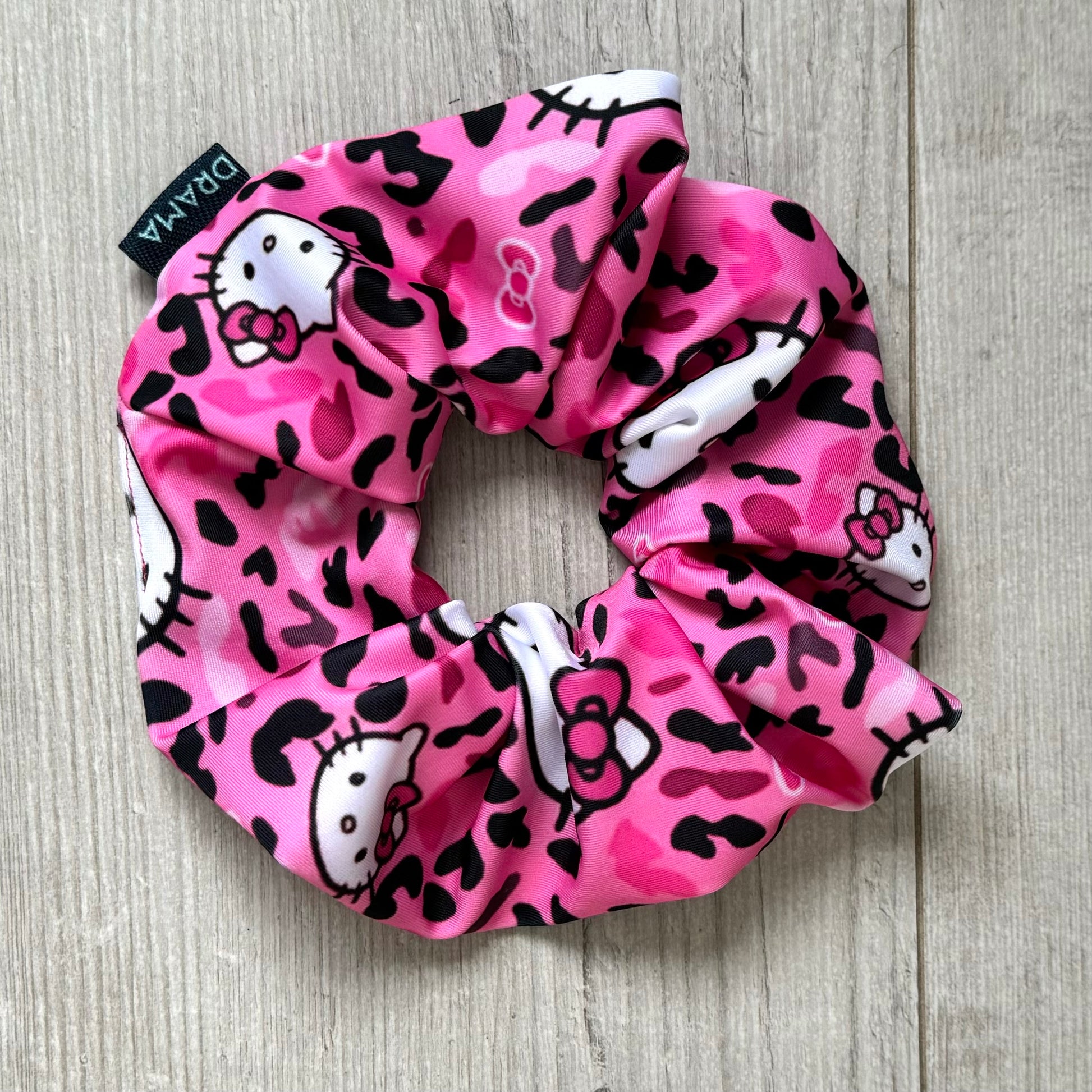 Collet scrunchie Kitty hecho a mano con tela de lycra elasticada. Gentil con el cabello.