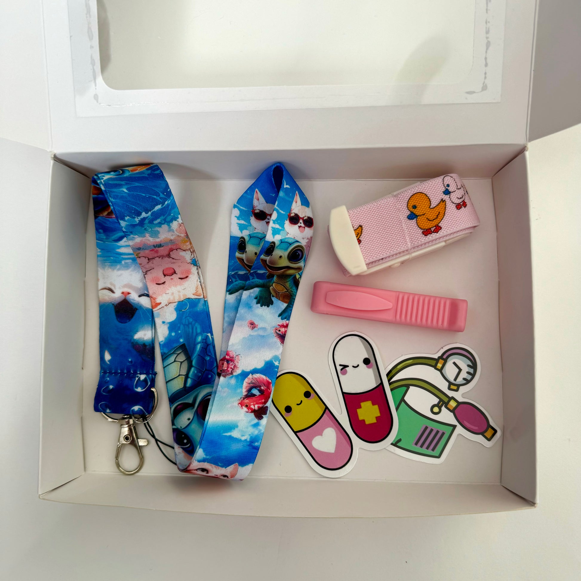 Set 20 incluye: 1 lanyard + 1 torniquete animado + 1 rompeampolla + 2 stickers + caja